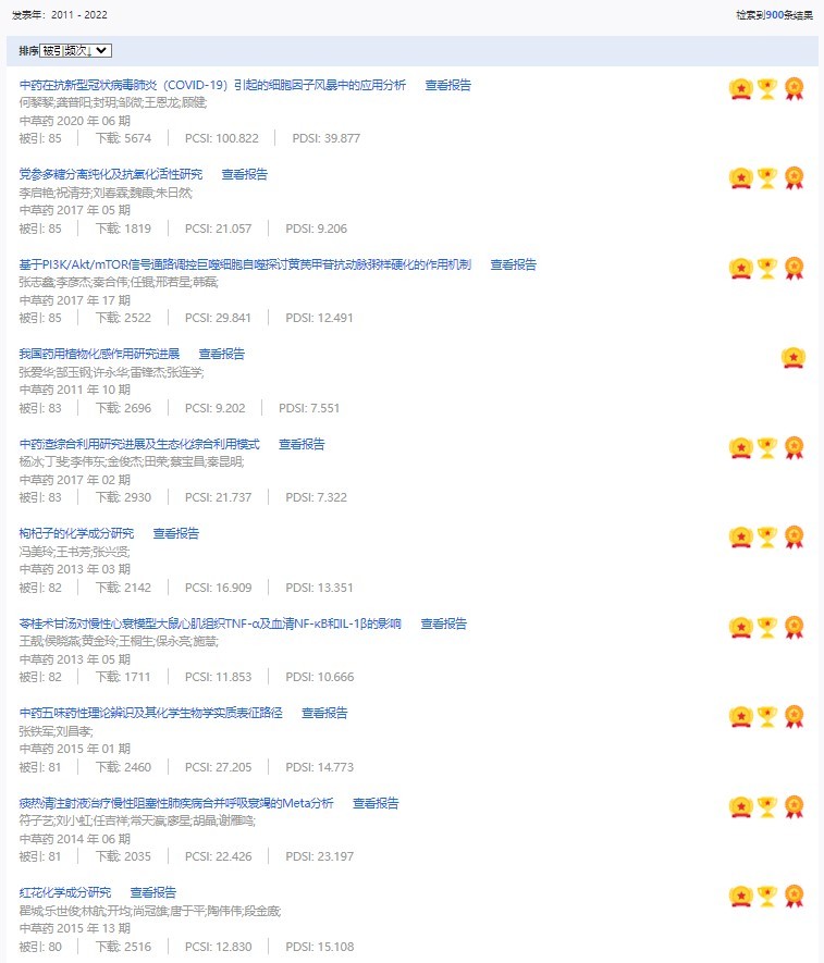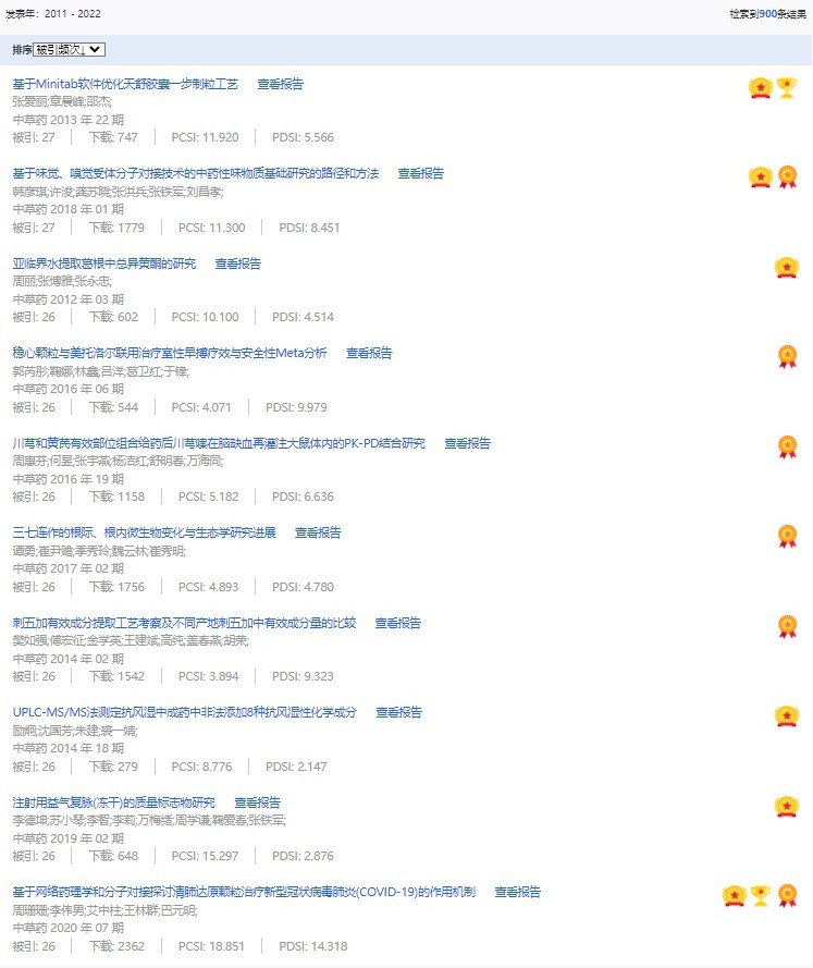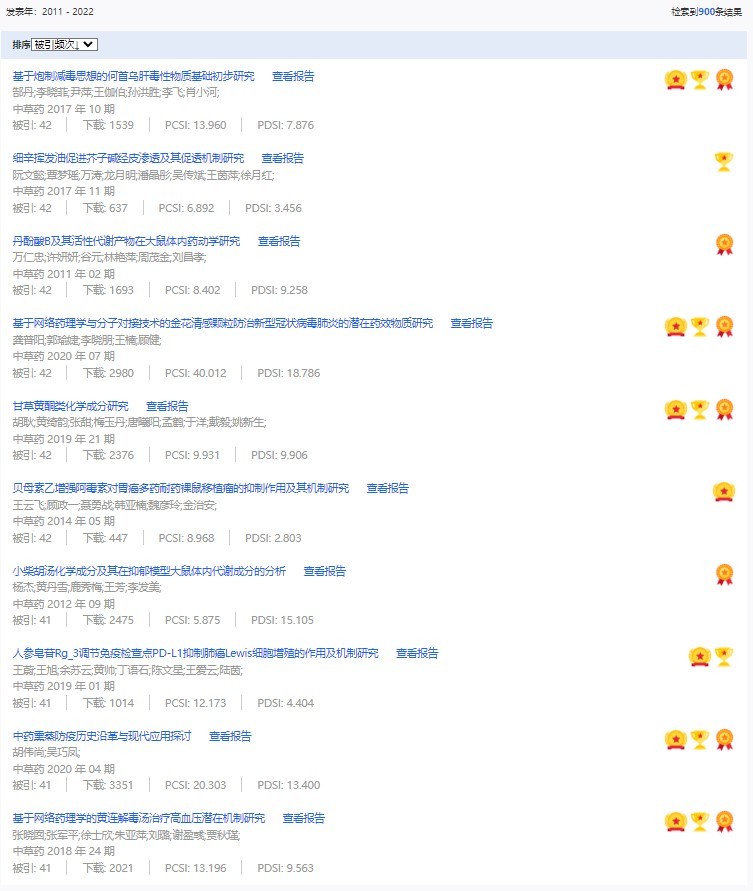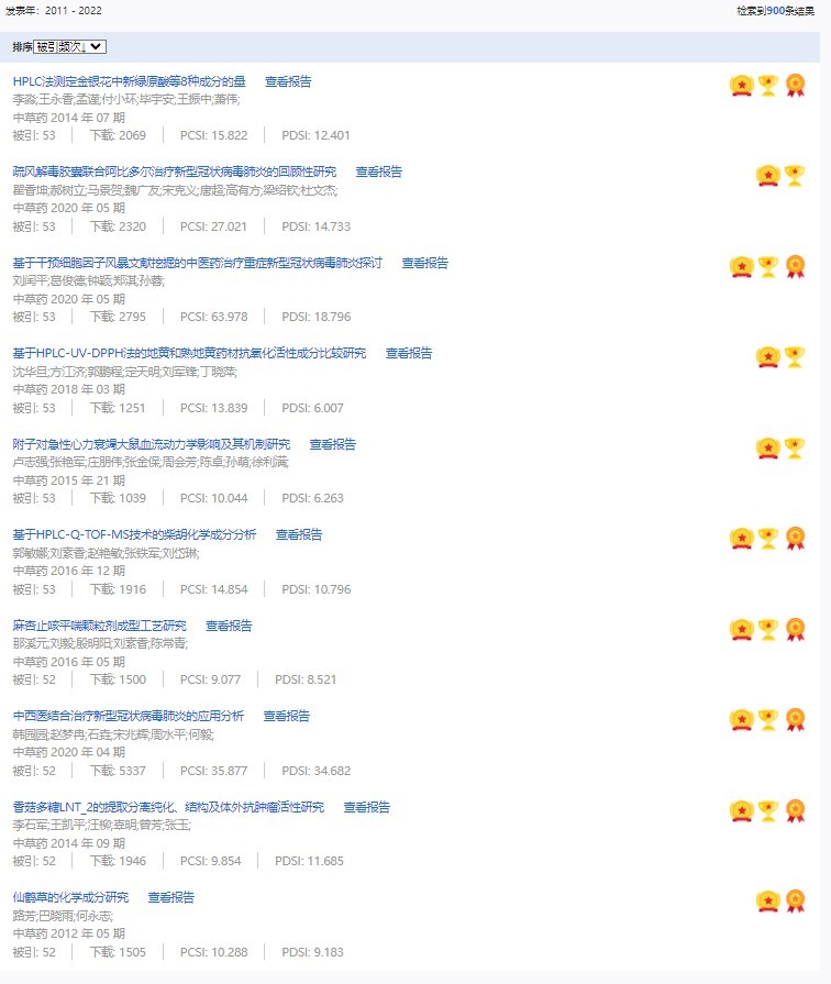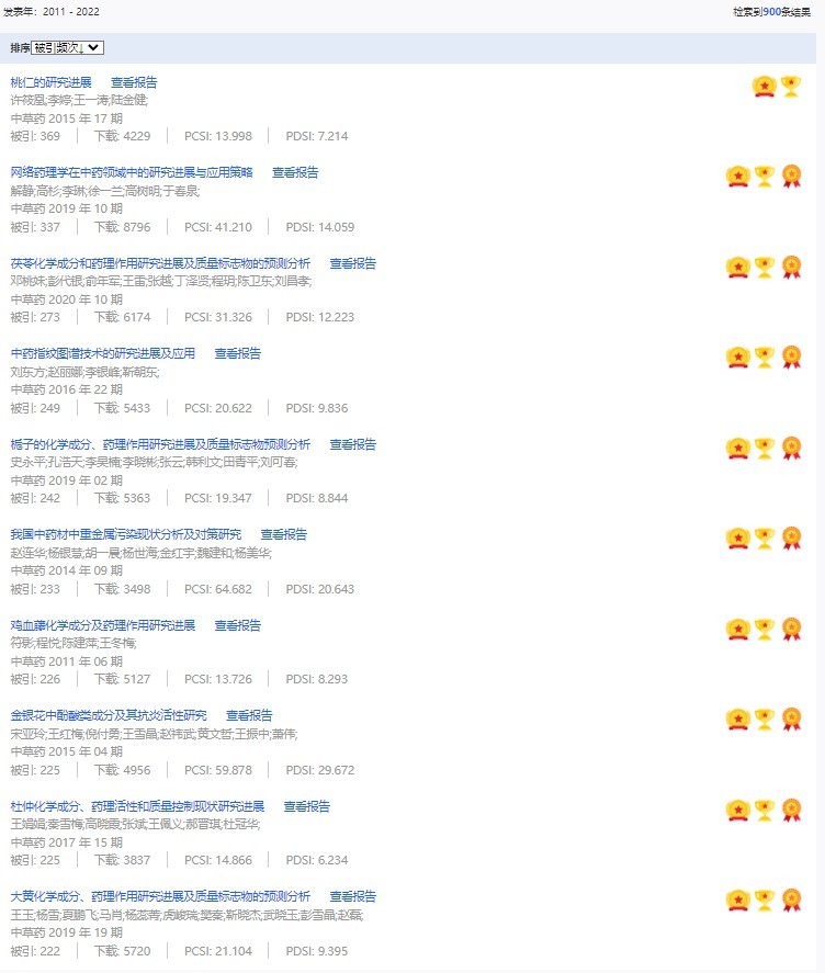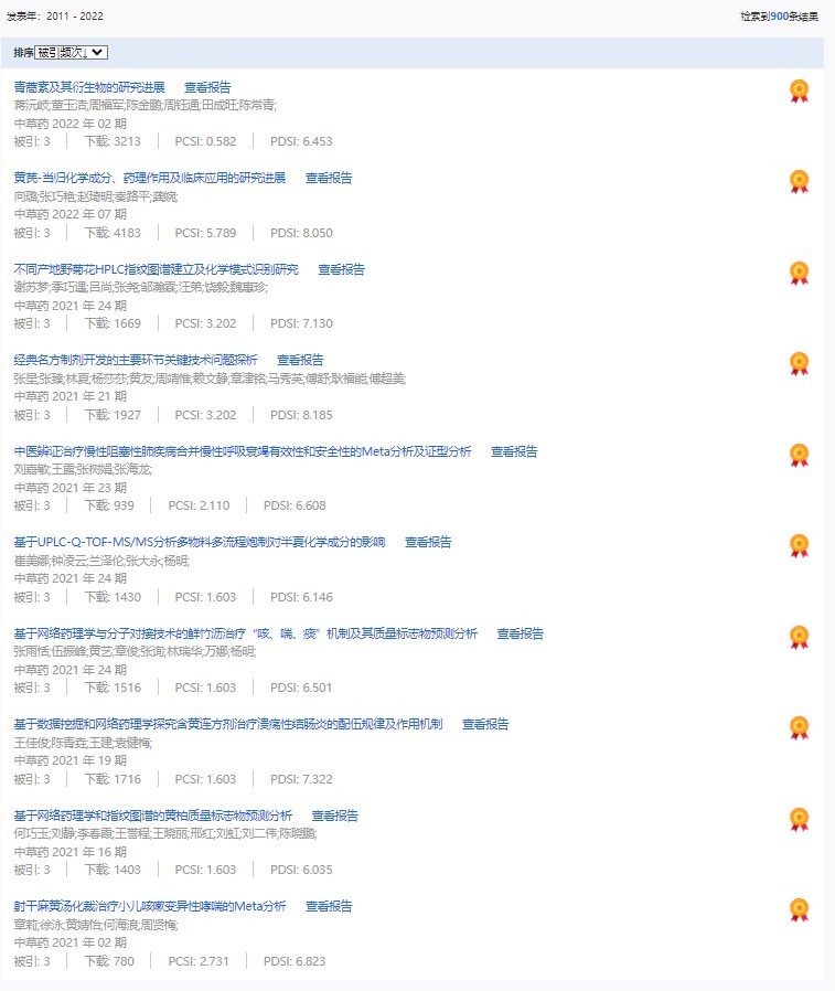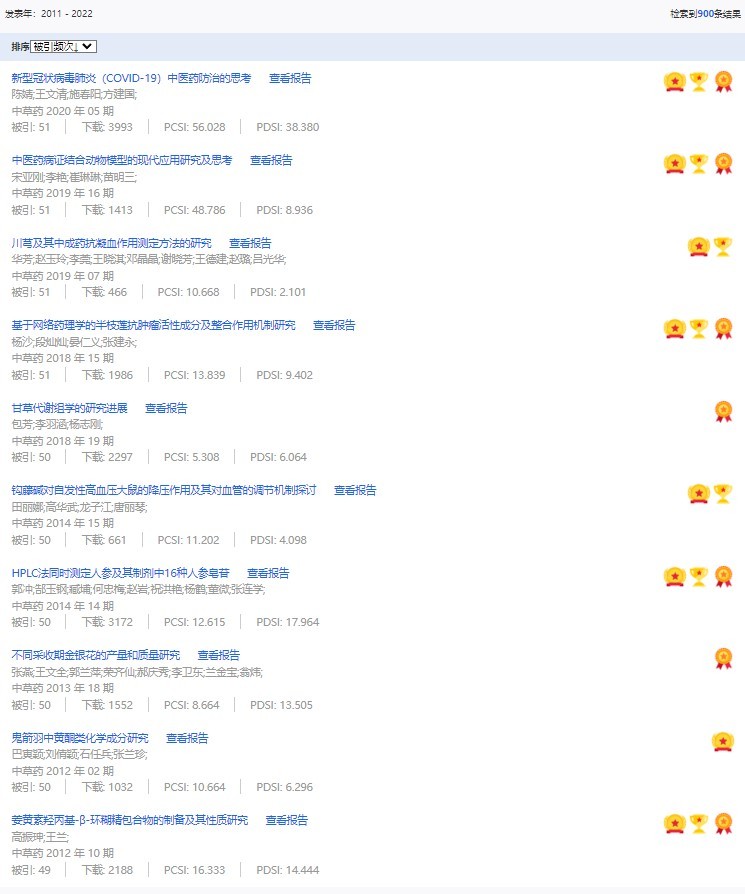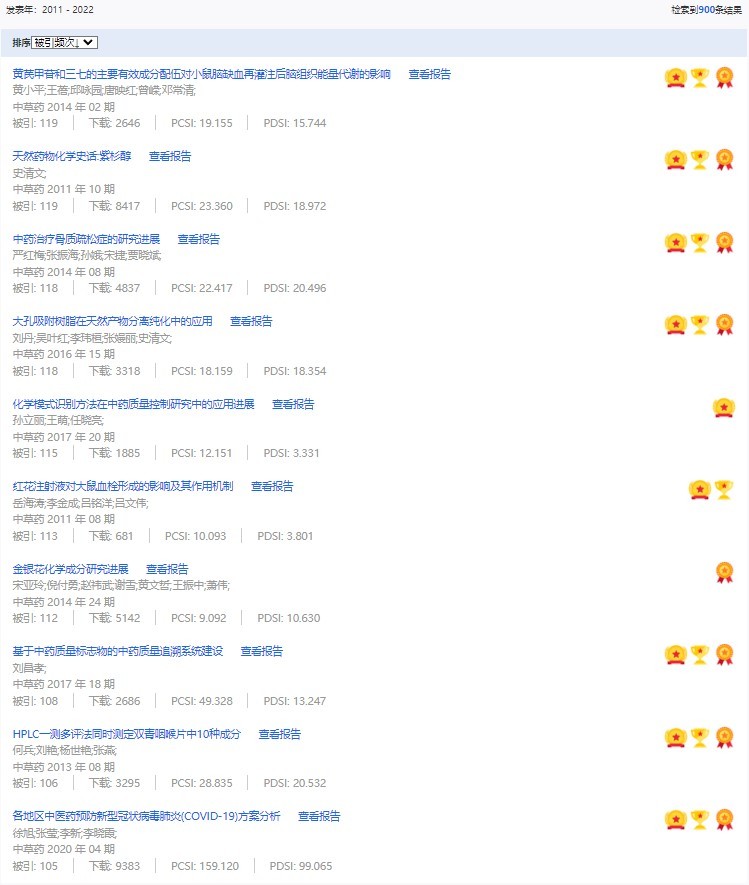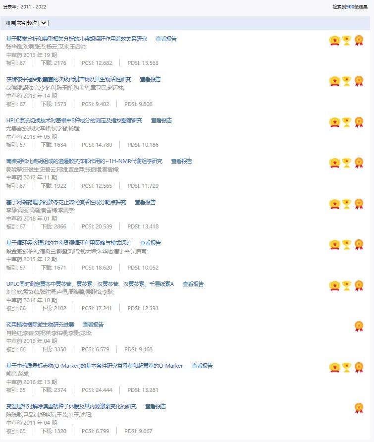 《中草藥》共入選900篇高影響力論文,同時(shí)獲得“高PCSI、高被引、高下載”的論文252篇。900篇高影響力論文名單見附表。