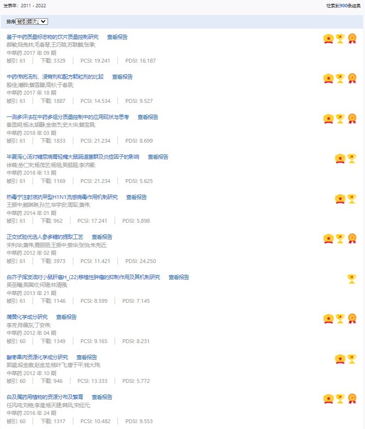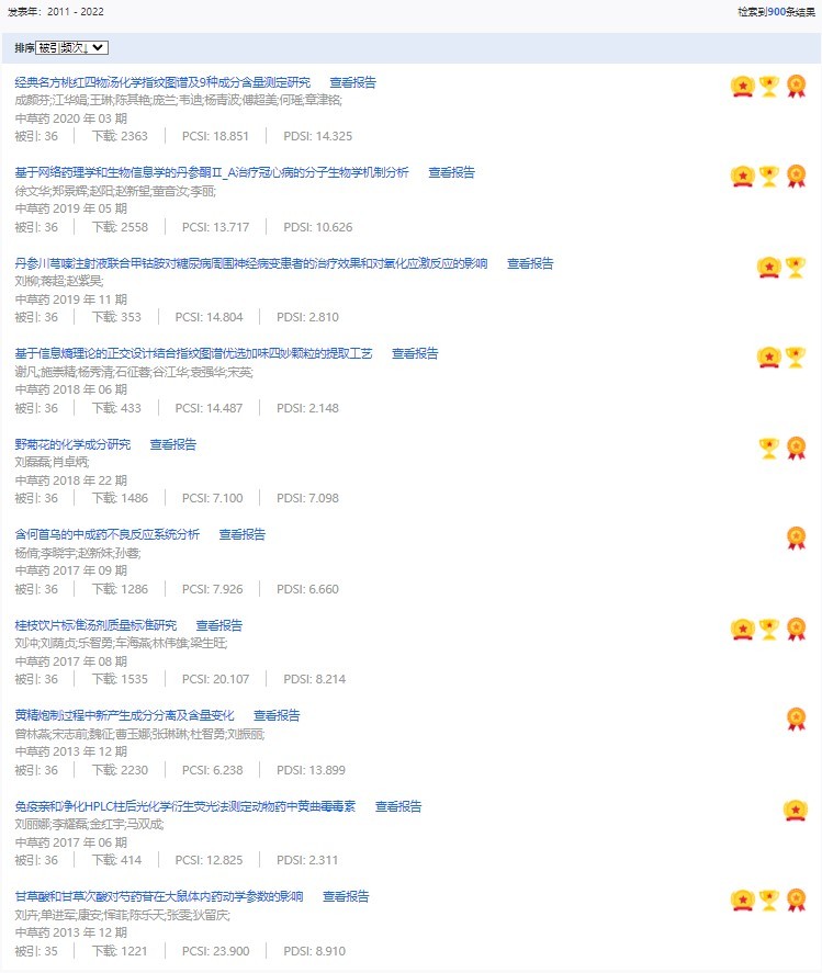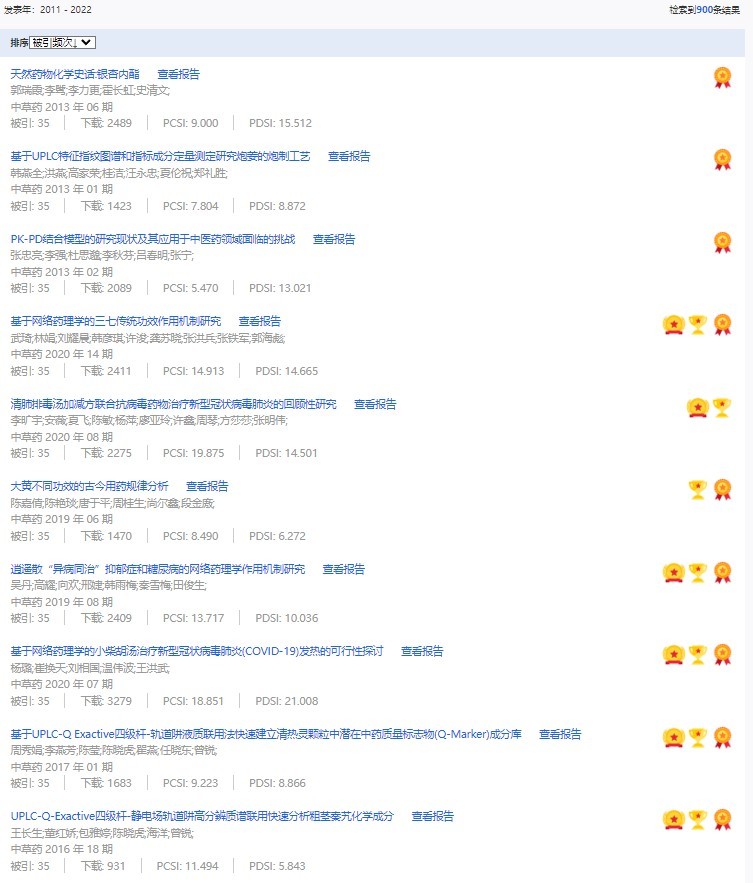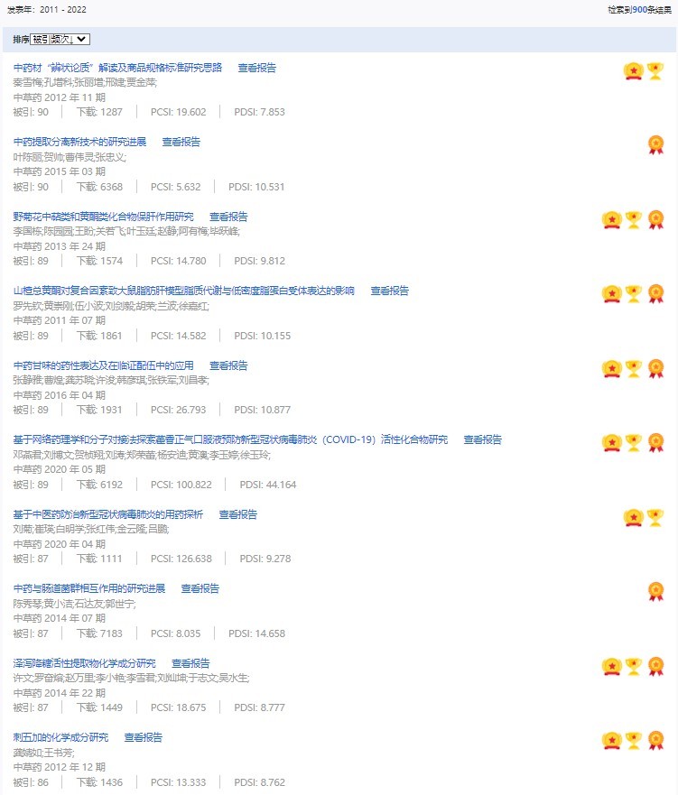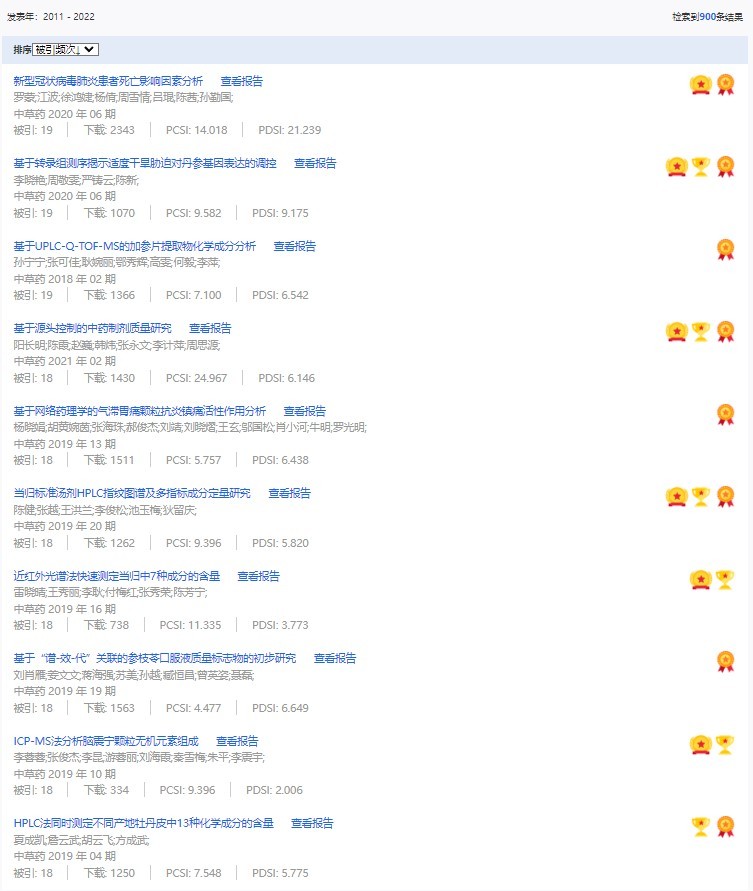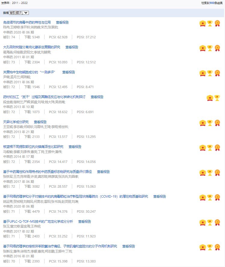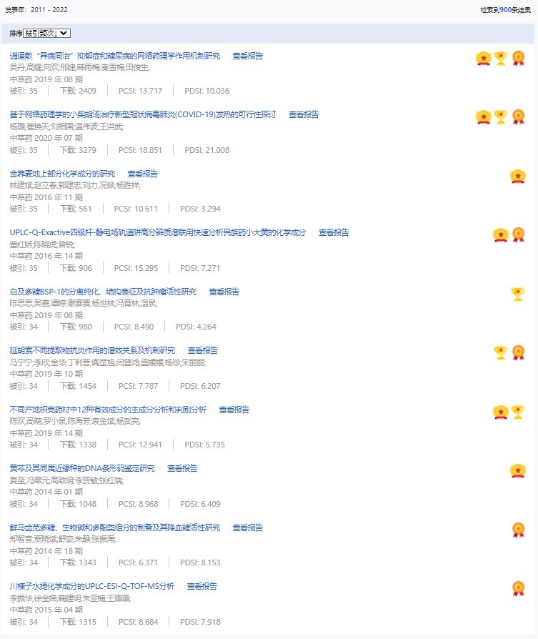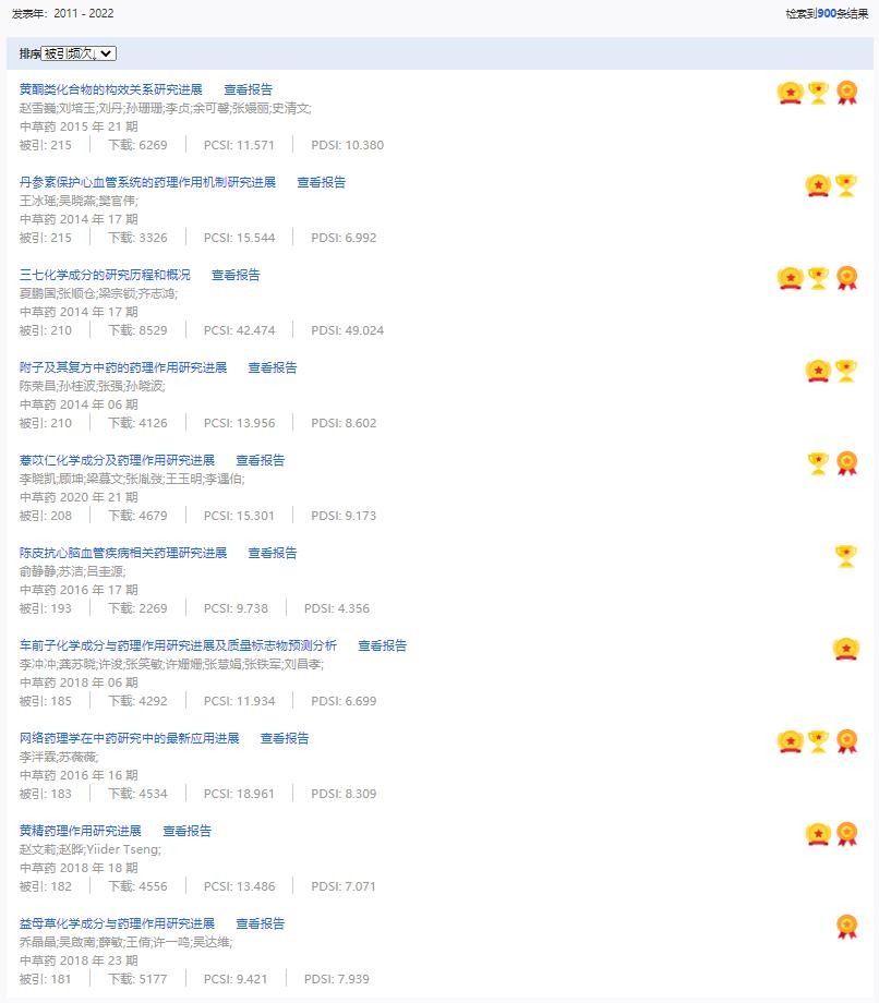 《中草藥》共入選900篇高影響力論文,同時(shí)獲得“高PCSI、高被引、高下載”的論文252篇。900篇高影響力論文名單見附表。