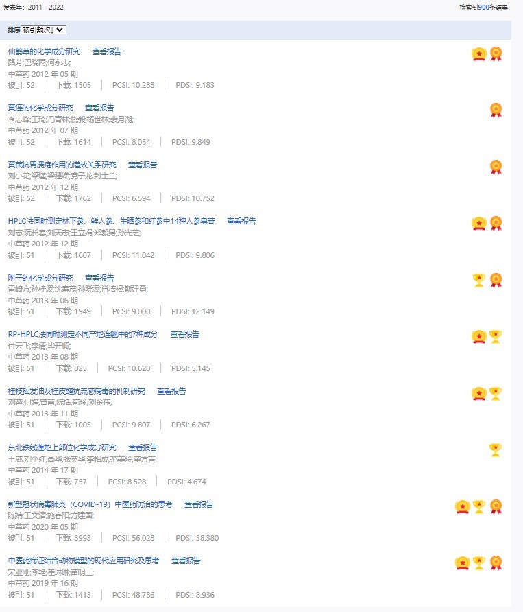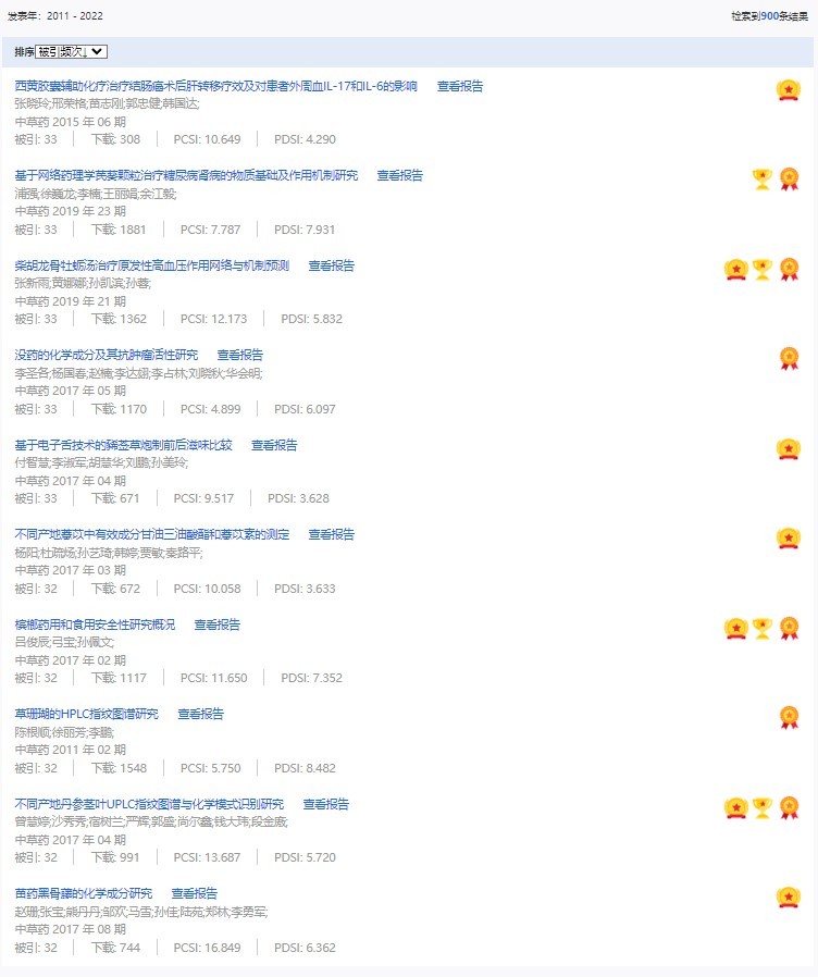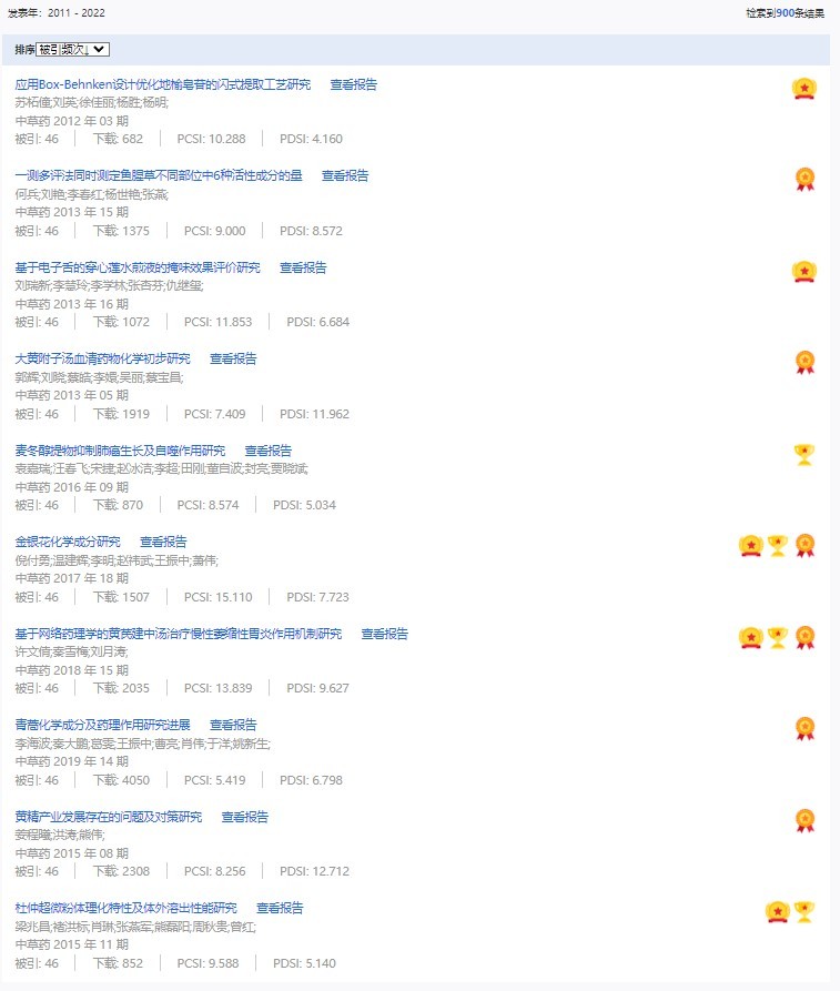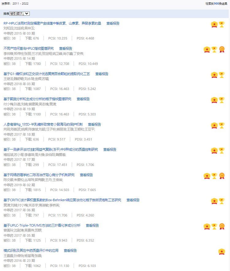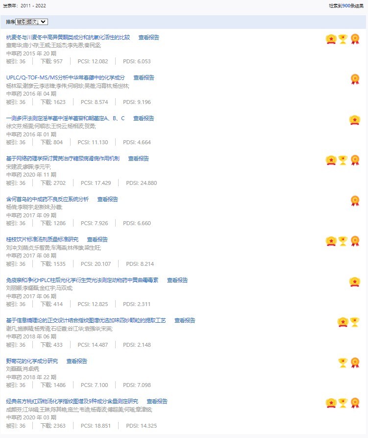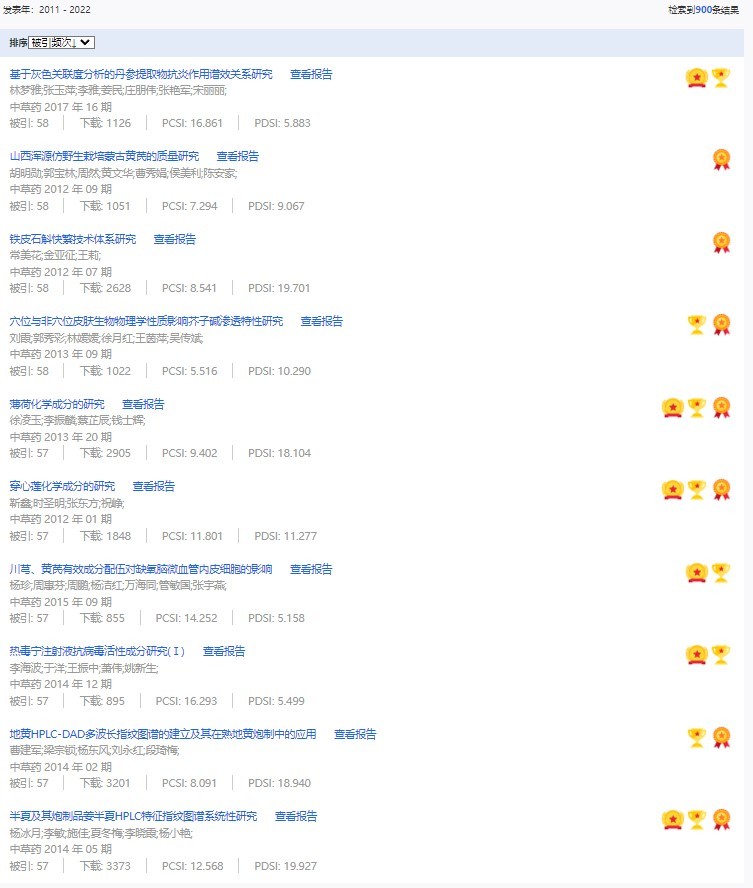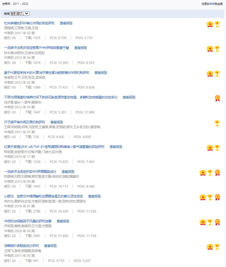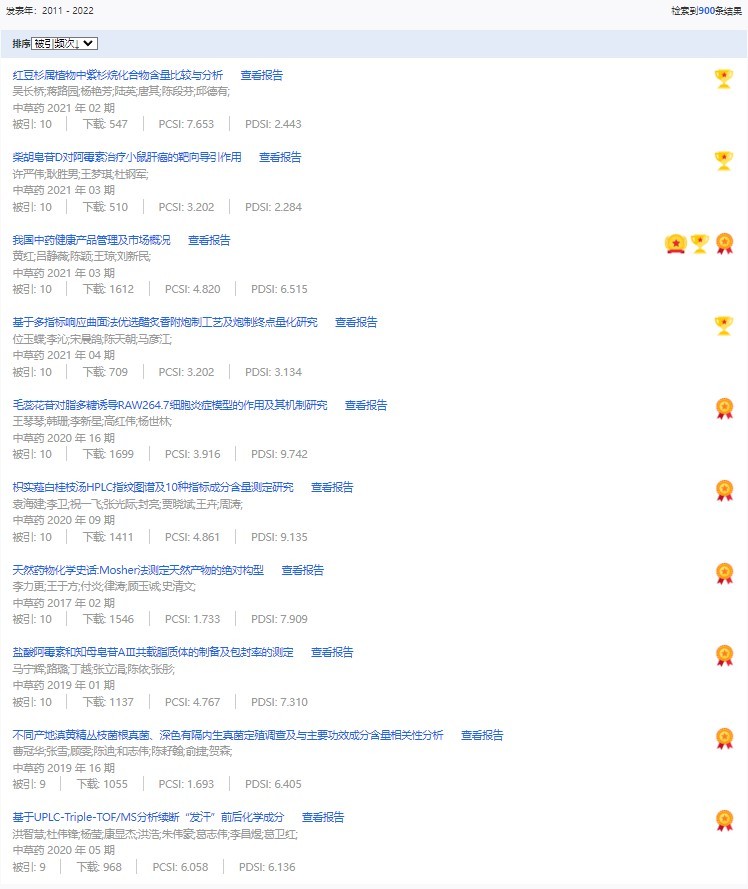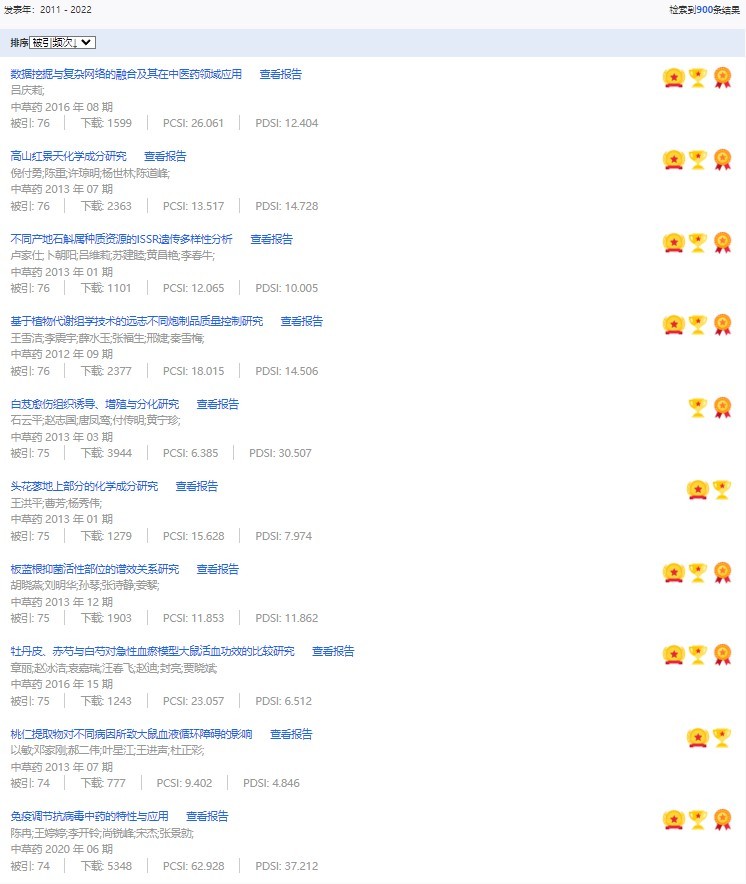 《中草藥》共入選900篇高影響力論文,同時(shí)獲得“高PCSI、高被引、高下載”的論文252篇。900篇高影響力論文名單見附表。