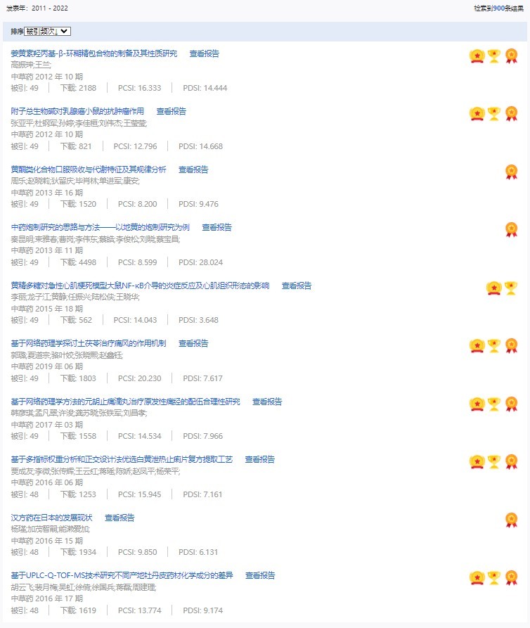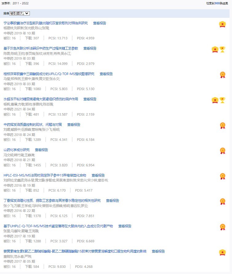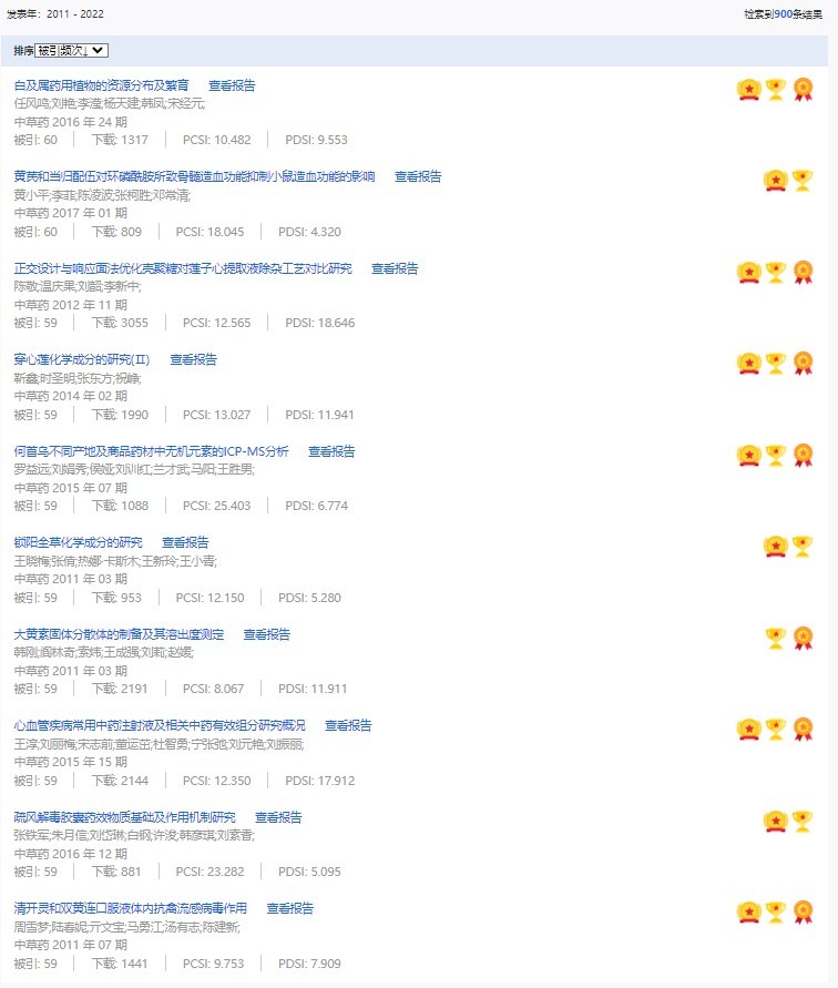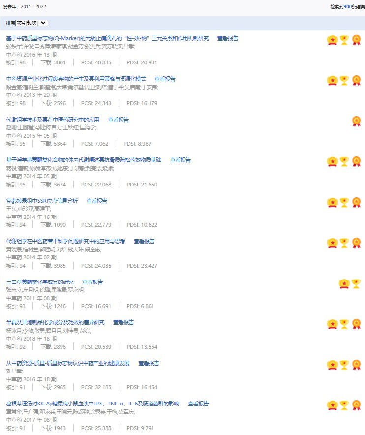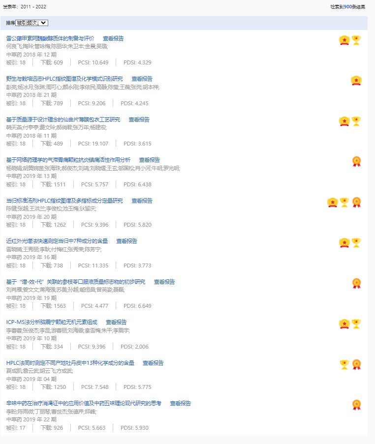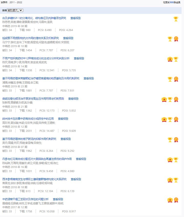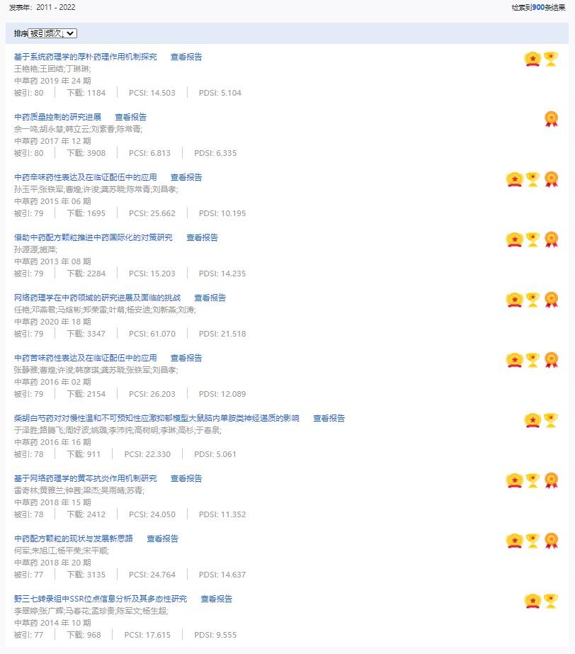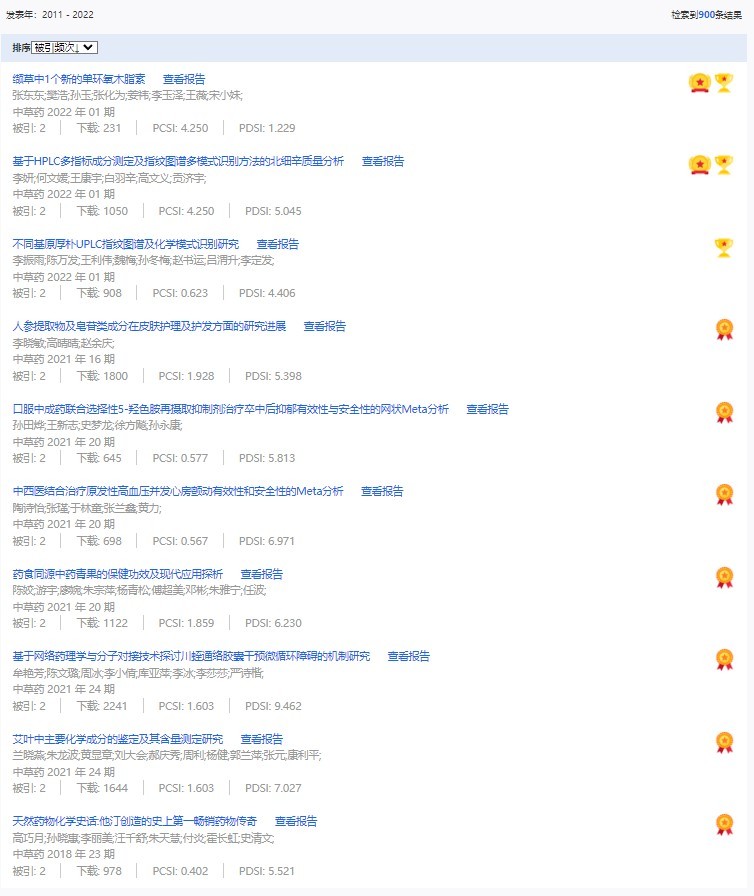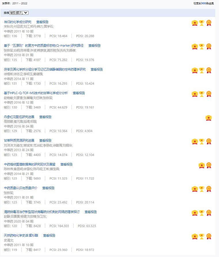 《中草藥》共入選900篇高影響力論文,同時(shí)獲得“高PCSI、高被引、高下載”的論文252篇。900篇高影響力論文名單見附表。