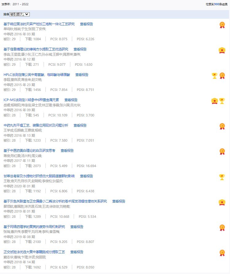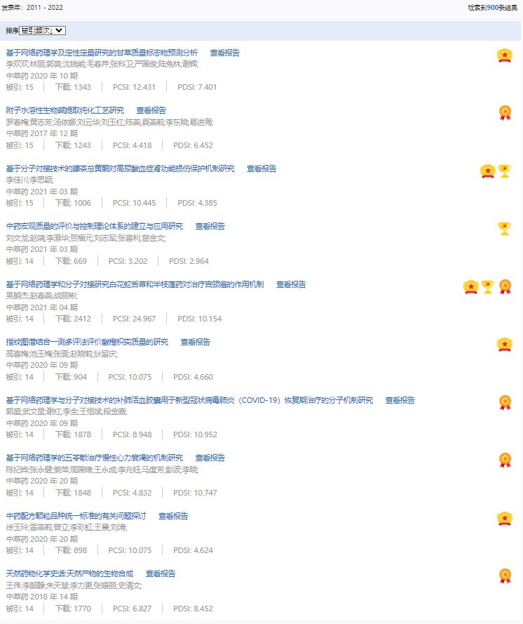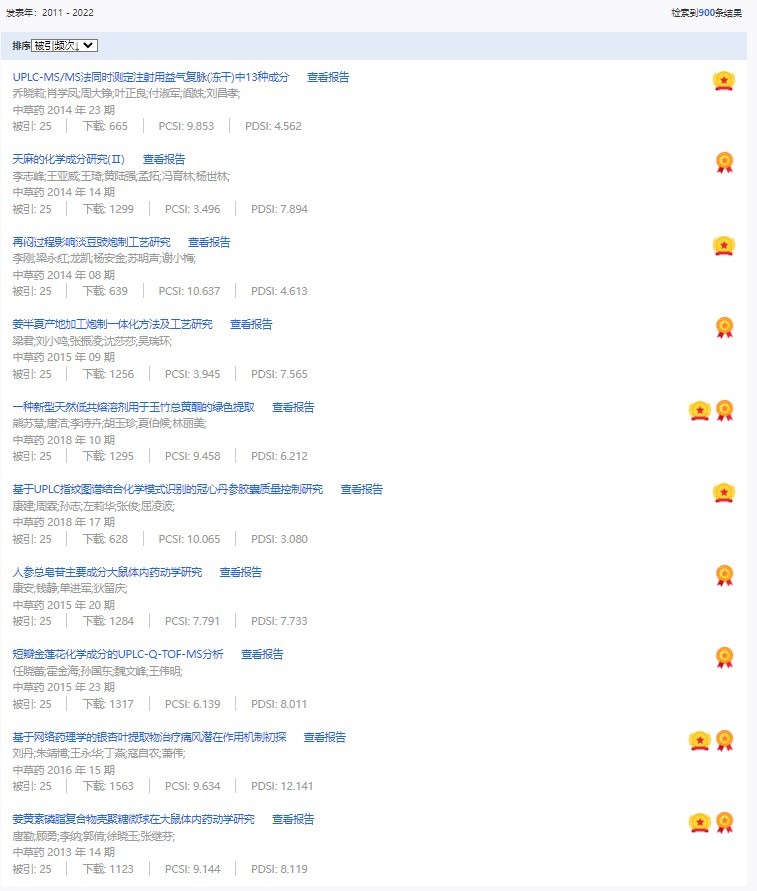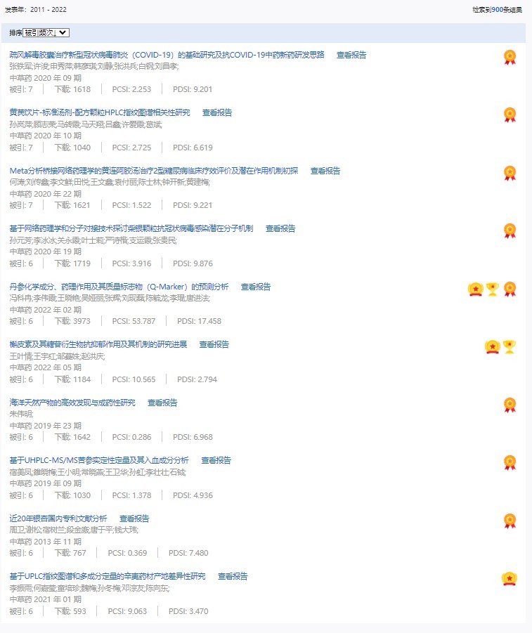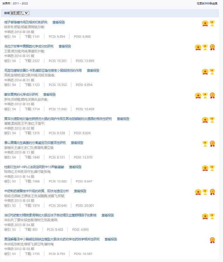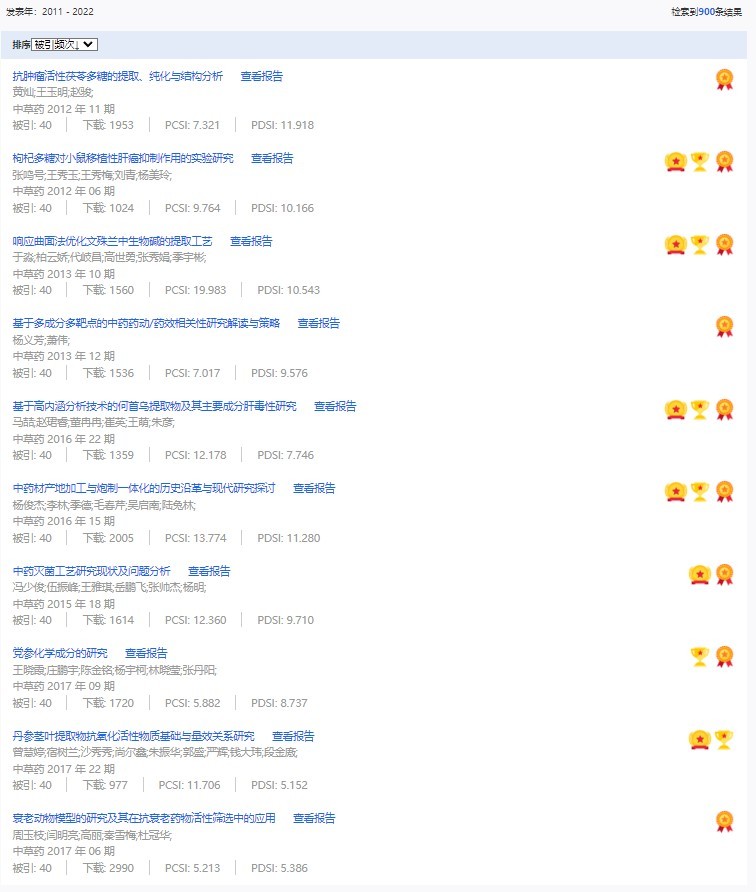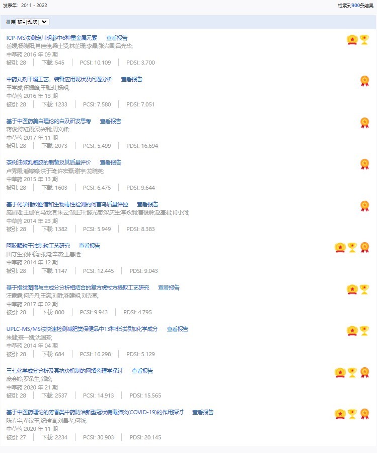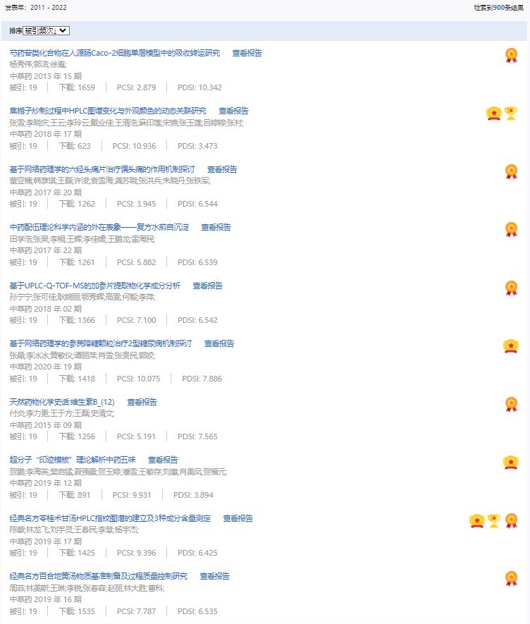 《中草藥》共入選900篇高影響力論文,同時(shí)獲得“高PCSI、高被引、高下載”的論文252篇。900篇高影響力論文名單見附表。