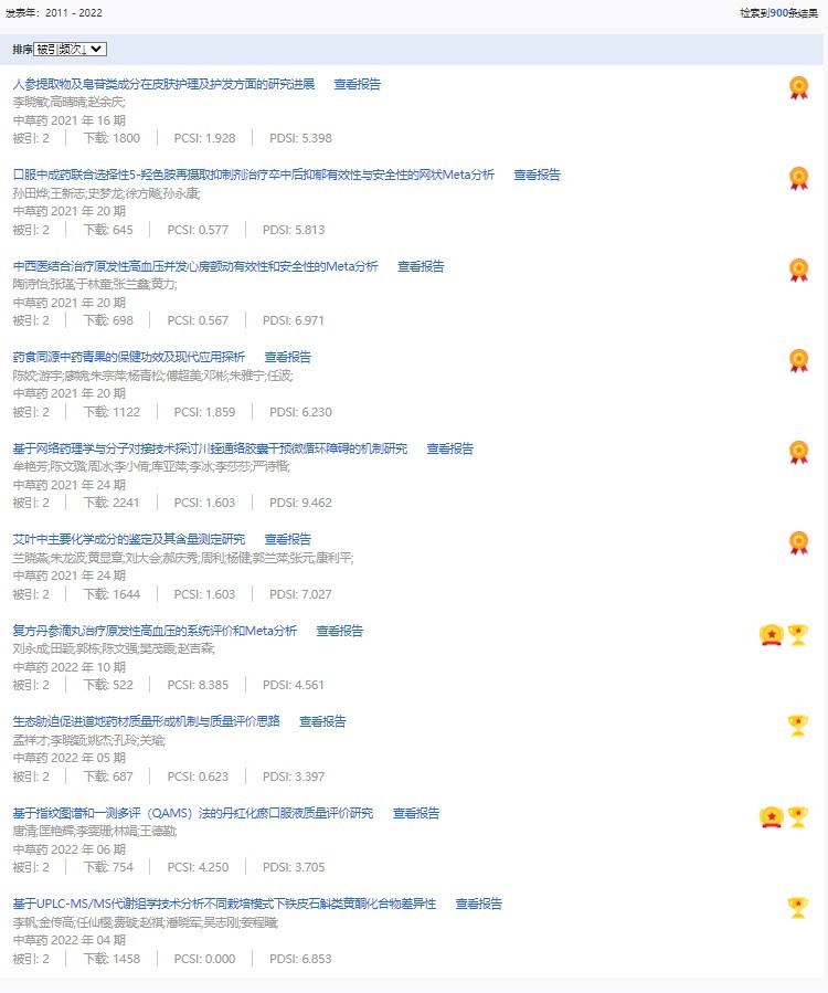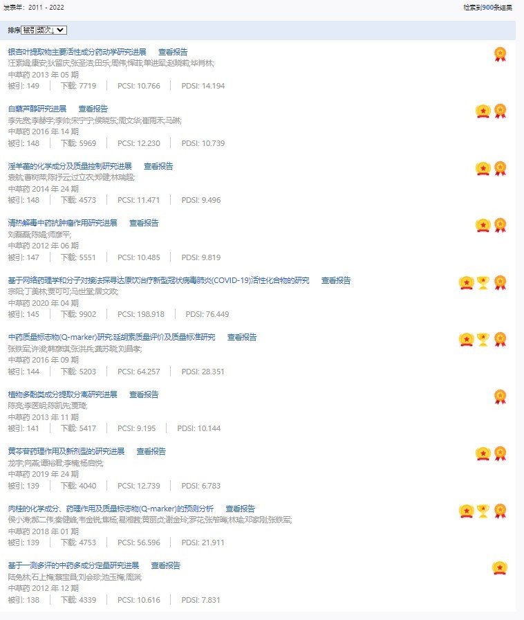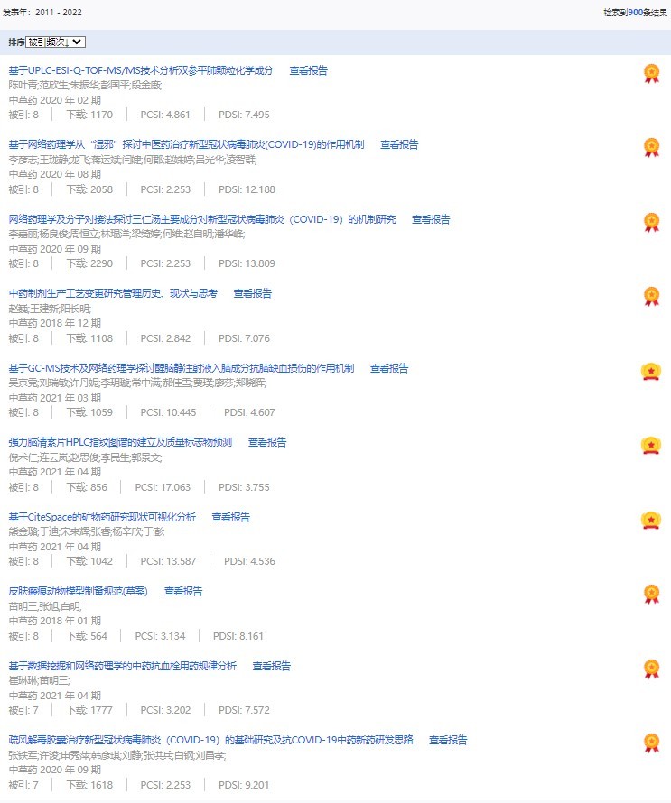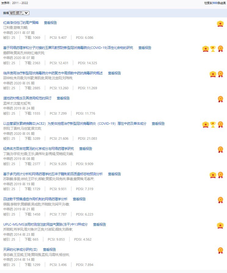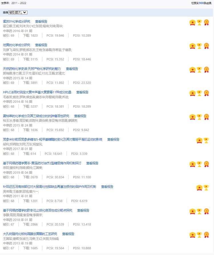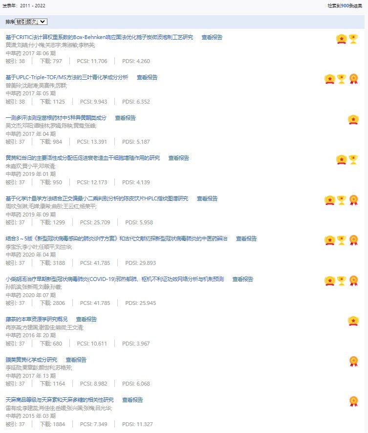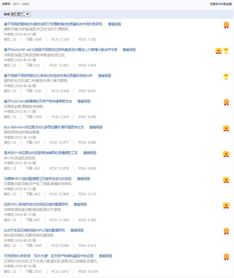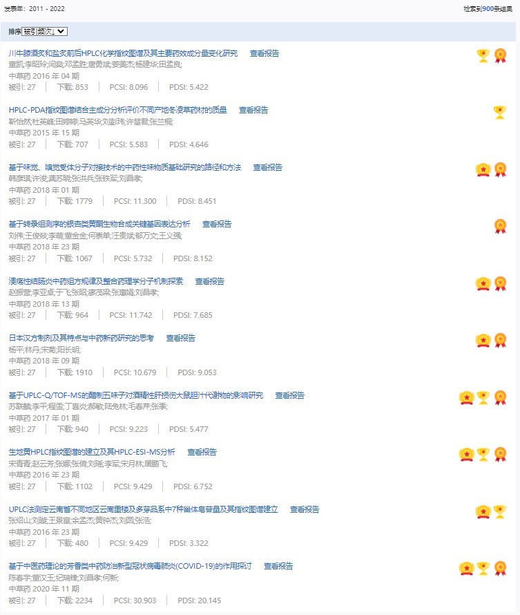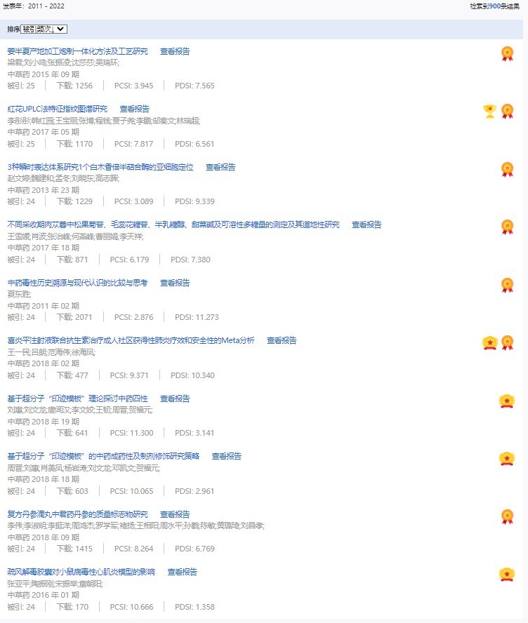《中草藥》共入選900篇高影響力論文,同時(shí)獲得“高PCSI、高被引、高下載”的論文252篇。900篇高影響力論文名單見附表。