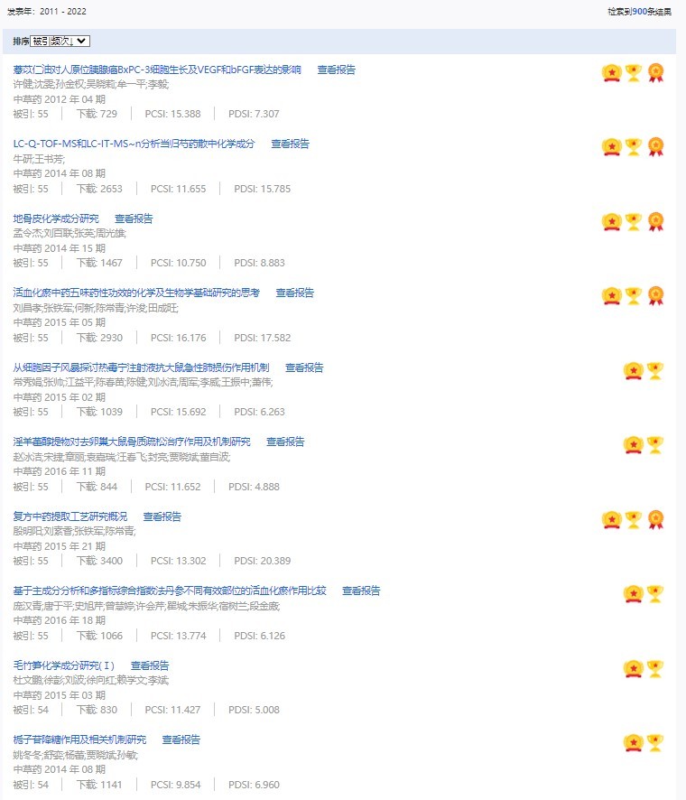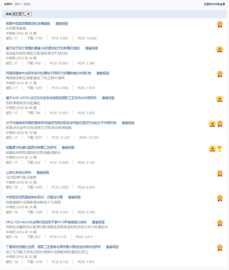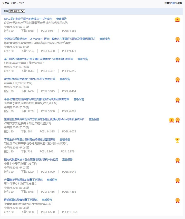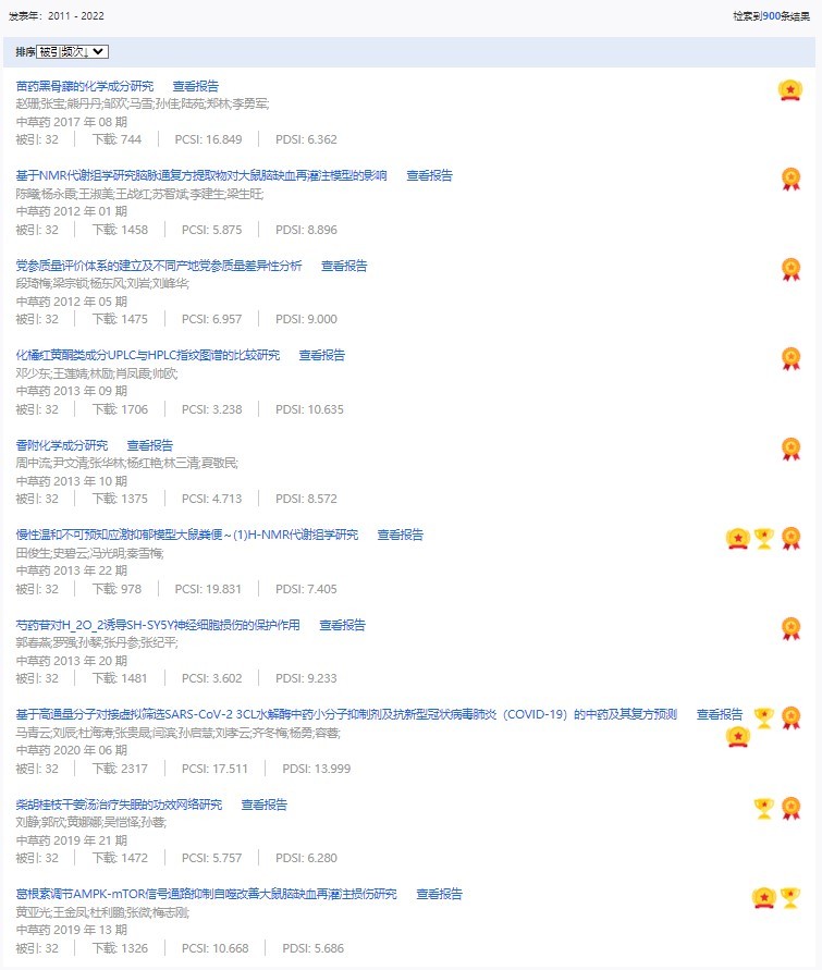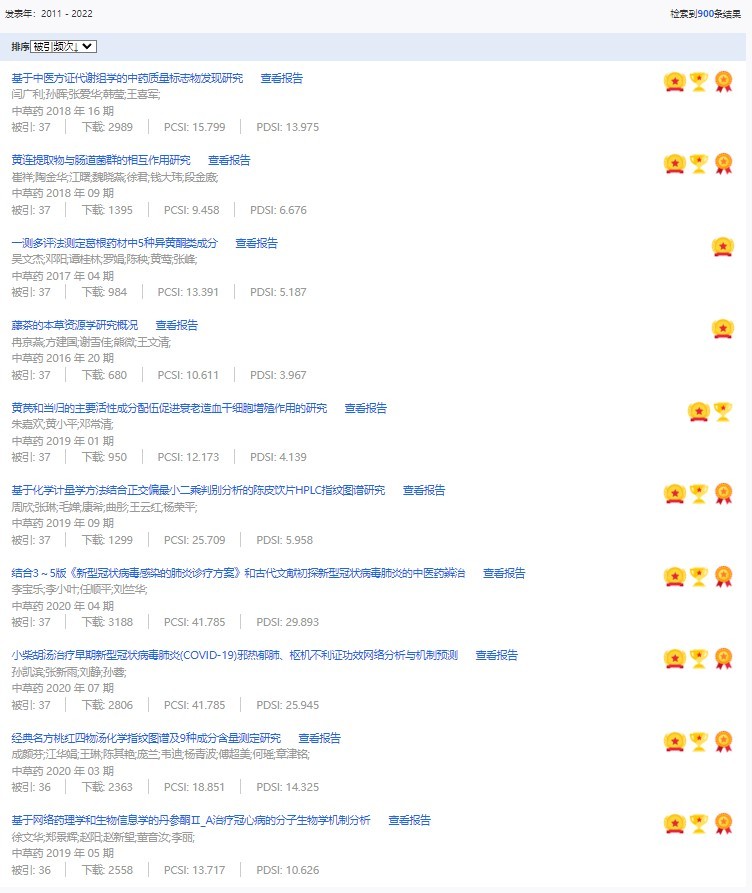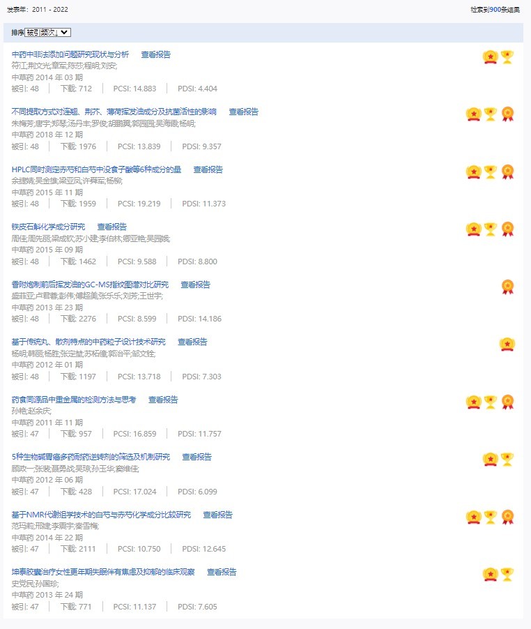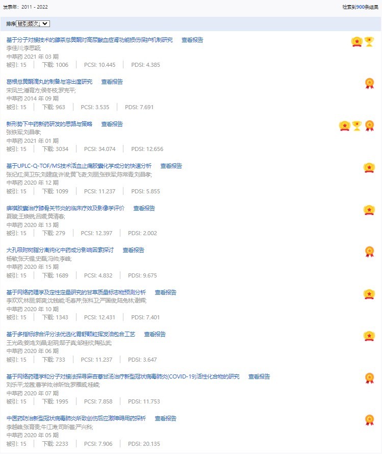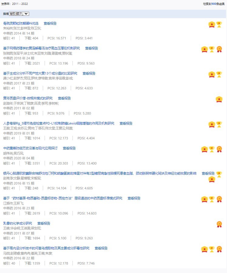 《中草藥》共入選900篇高影響力論文,同時(shí)獲得“高PCSI、高被引、高下載”的論文252篇。900篇高影響力論文名單見附表。