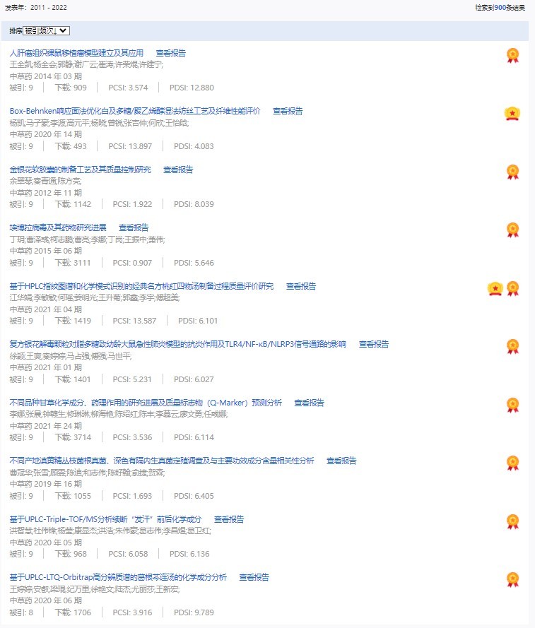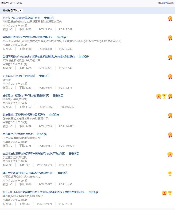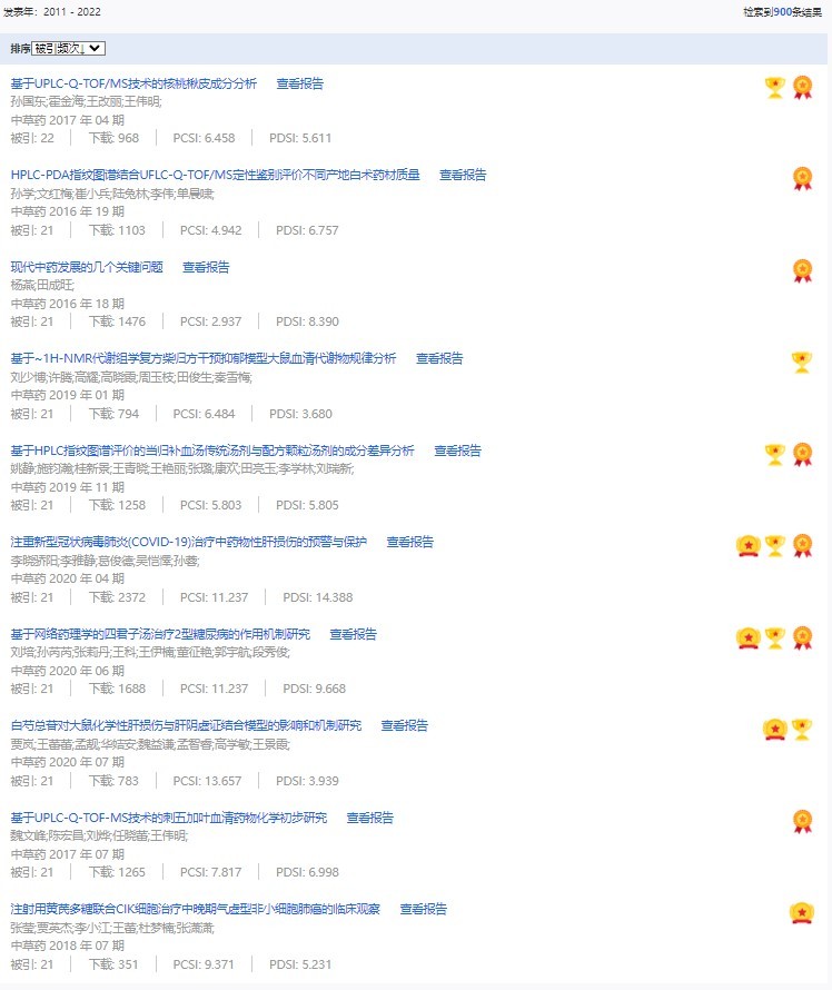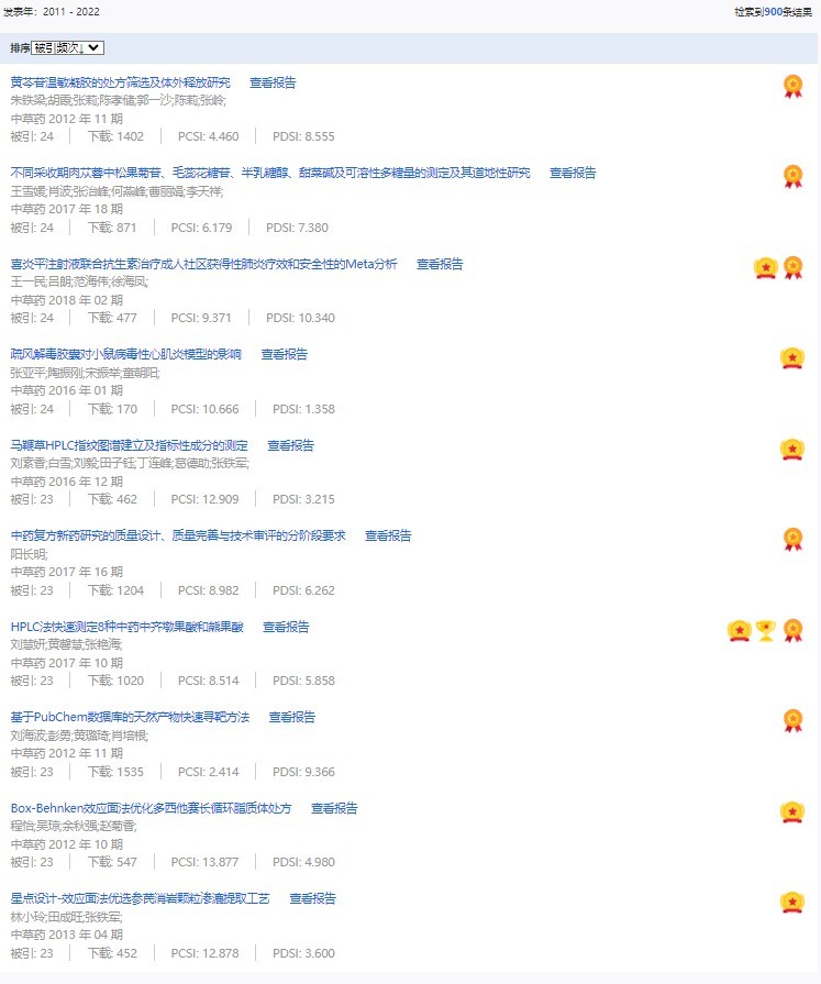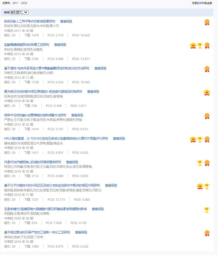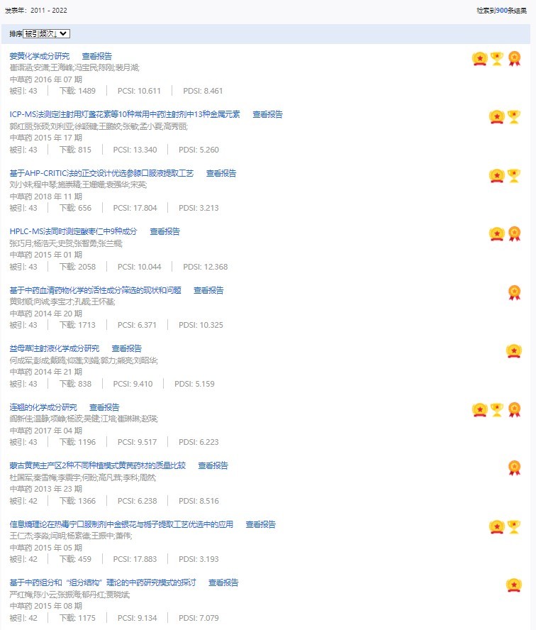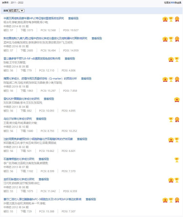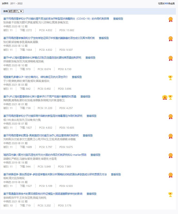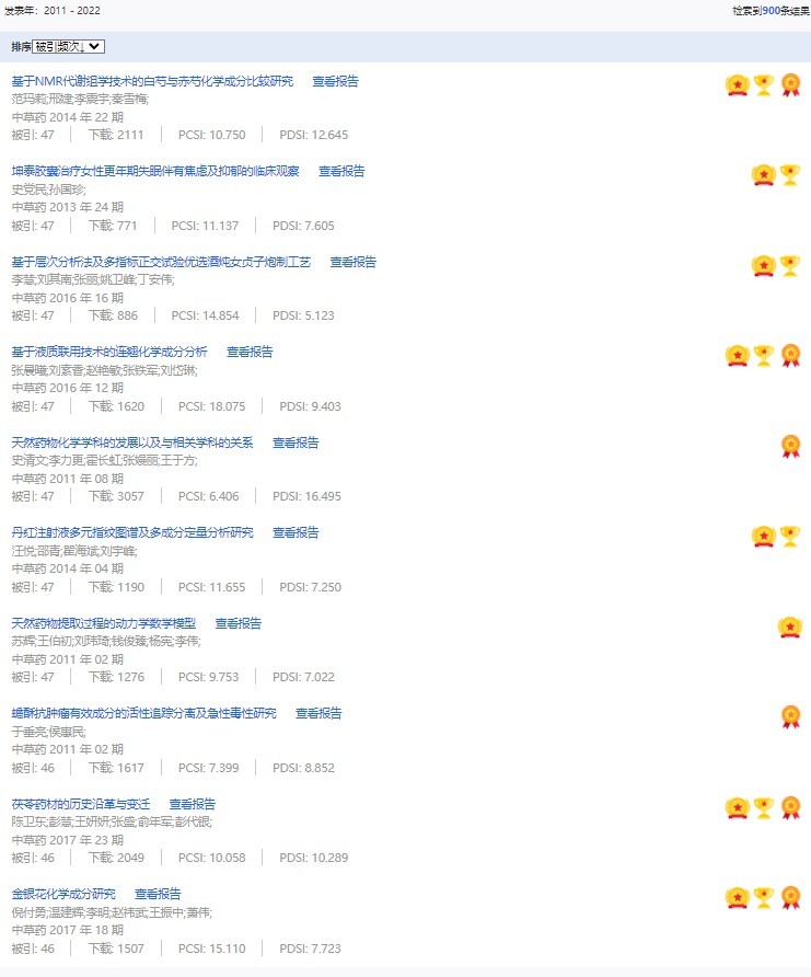 《中草藥》共入選900篇高影響力論文,同時(shí)獲得“高PCSI、高被引、高下載”的論文252篇。900篇高影響力論文名單見附表。