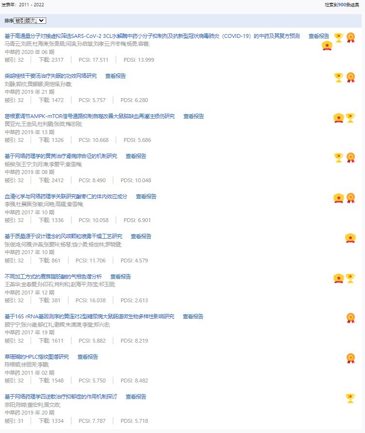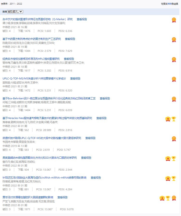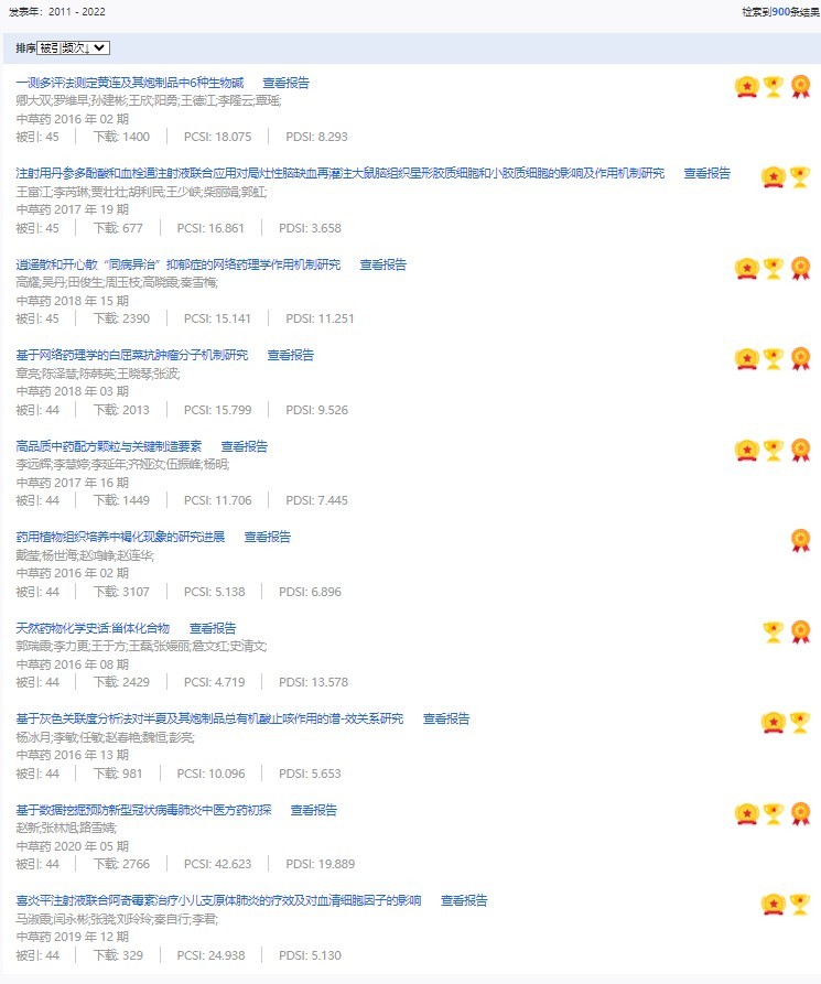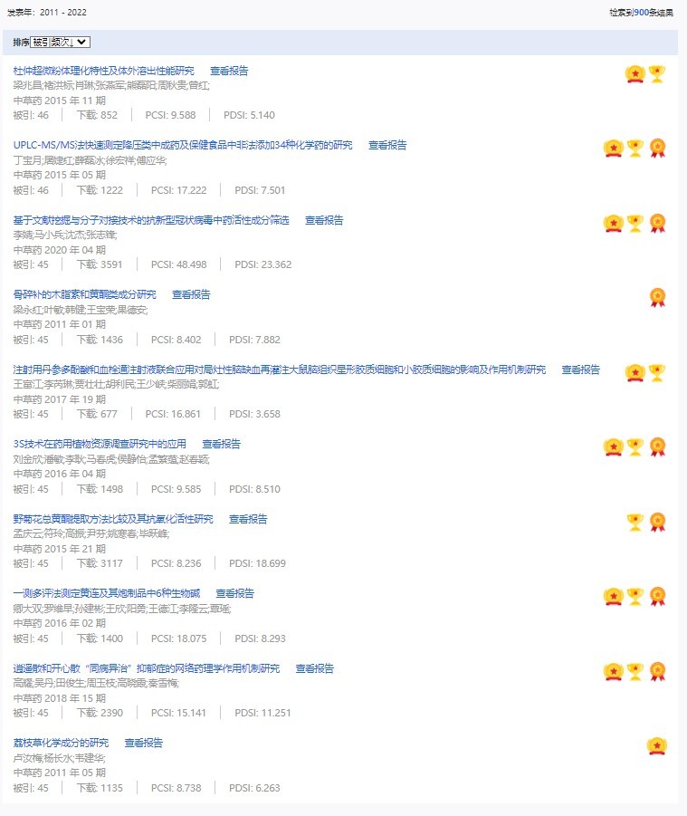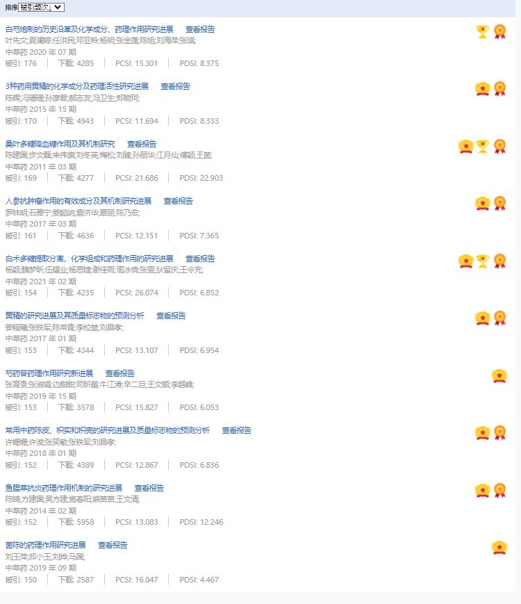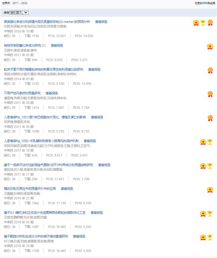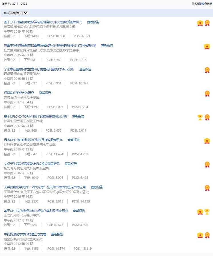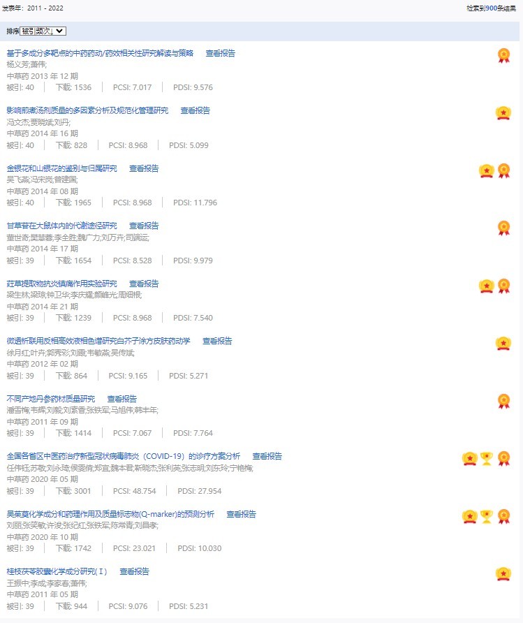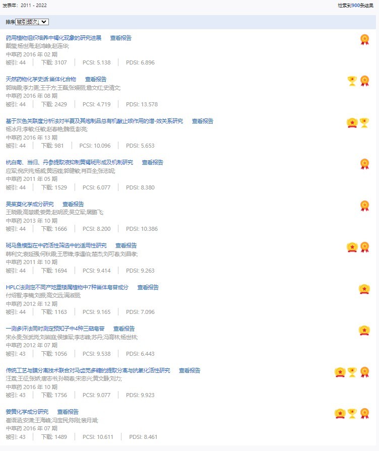 《中草藥》共入選900篇高影響力論文,同時(shí)獲得“高PCSI、高被引、高下載”的論文252篇。900篇高影響力論文名單見附表。