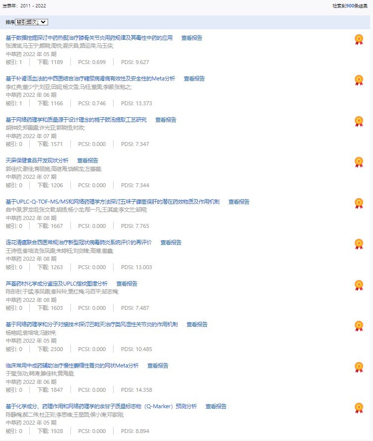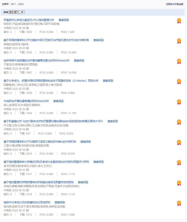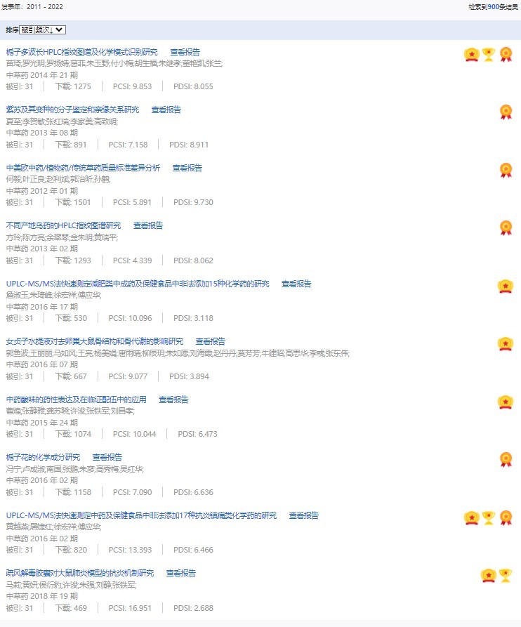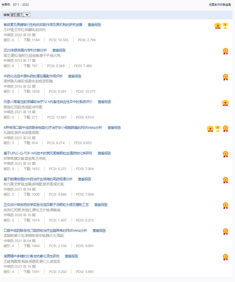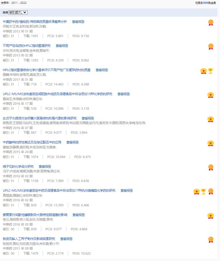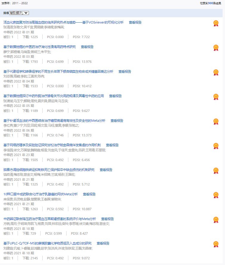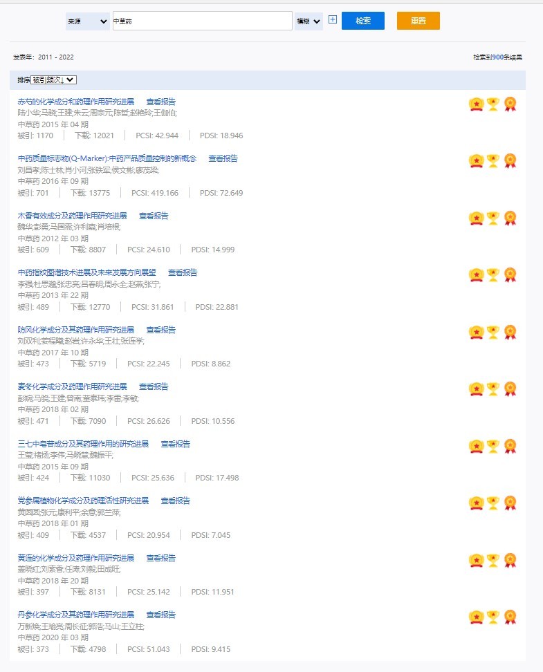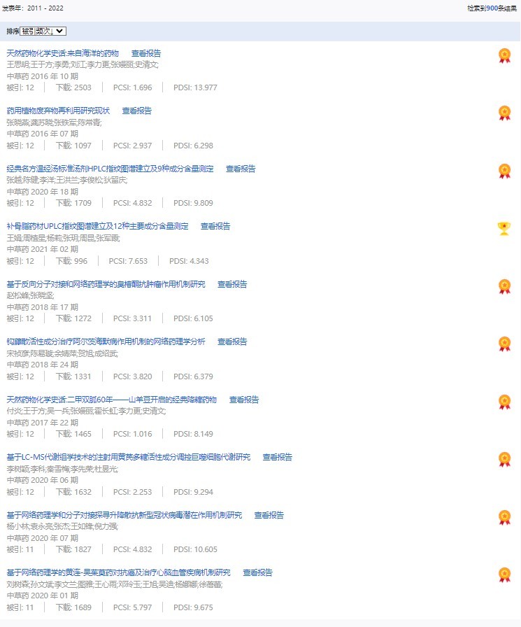 《中草藥》共入選900篇高影響力論文,同時(shí)獲得“高PCSI、高被引、高下載”的論文252篇。900篇高影響力論文名單見附表。