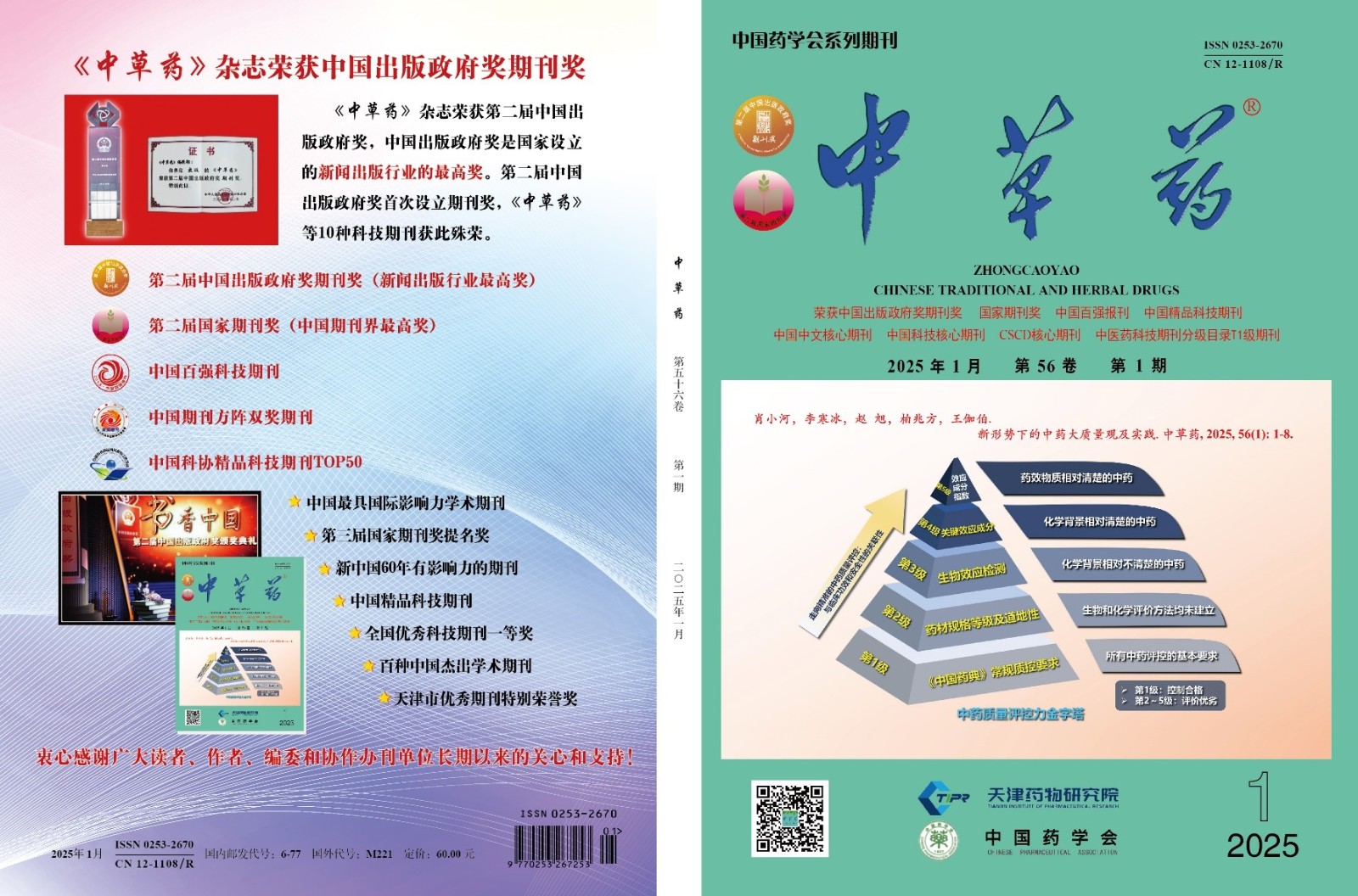 《中草藥》雜志是由天津藥物研究院和中國藥學(xué)會(huì)共同主辦的國家級(jí)期刊,半月刊,國內(nèi)外公開發(fā)行。創(chuàng)始于1970年1月,主編為陳士林院士。榮獲首屆全國優(yōu)秀科技期刊評(píng)比一等獎(jiǎng);中國期刊方陣“雙獎(jiǎng)期刊”;國家期刊獎(jiǎng)(期刊界最高獎(jiǎng));中國出版政府獎(jiǎng)期刊獎(jiǎng)(我國新聞出版行業(yè)最高獎(jiǎng));中國百強(qiáng)科技期刊;新中國60年有影響力的期刊;百種中國杰出學(xué)術(shù)期刊;天津市優(yōu)秀期刊“特別榮譽(yù)獎(jiǎng)”;中國精品科技期刊。本刊為中國科技核心期刊、中文核心期刊、CSCD核心期刊?!吨胁菟帯冯s志2024年核心影響因子為3.132,位列我國中藥學(xué)類期刊第1,總被引頻次15 354。